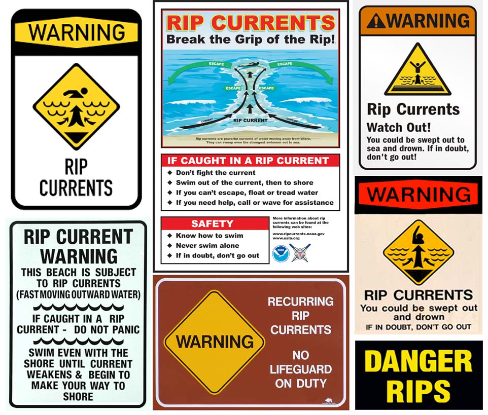 • Красные или чёрные флажки и таблички на пляже (типа “Dangerous Rip Curent!”).