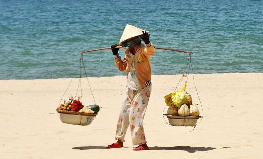 Широкую прибрежную зону, растянувшуюся вблизи северо-восточного города Дананг, сложно назвать безлюдной. Здесь кипит жизнь: до полудня на белоснежном песке нежатся любители загара, которых после обеда сменяют те, кто мечтает поймать волну, промчаться на водных лыжах и поиграть в волейбол.