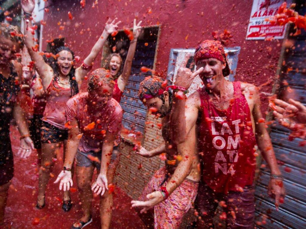 В последнюю среду августа улицы маленького испанского городка Буньоль окрашиваются в кровавый красный цвет, и тысячи людей собираются вместе, чтобы закидать друг друга помидорами в гигантской томатной битве. В побоище, длящемся всего час, расходуют 55000 кг помидоров! После чего всего бегут умываться к реке, а затем на вечеринку с сангрией и едой, которая длится всю ночь! Это определенно один из самых безумных и зрелищных фестивалей.