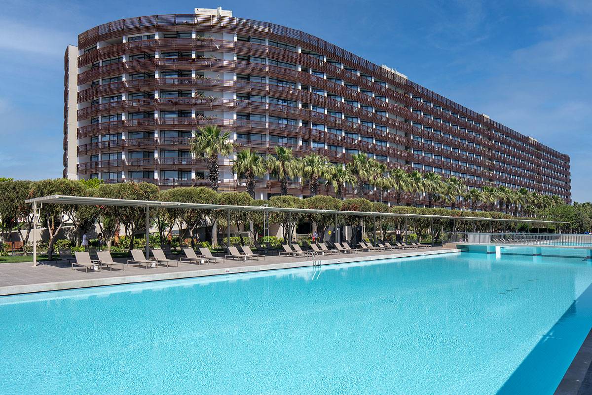 Пляжный отель в средиземноморском стиле уверенно занял 110 тысяч квадратных метров на первой линии, да еще и в черте города. Отпуск здесь — отличный выбор для тех, кто хочет не только с комфортом отдыхать у воды, но и собирается совершать вылазки в город.