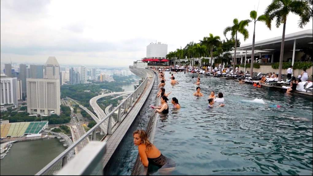 Еще один искусственный водоем из категории «Самых». Он признан самым высоким на планете, так как расположен на высоте 191 метр. Находится он на крыше небоскреба Marina Bay Sands. Помимо того, что создатели поместили свое оригинальное сооружение на одно из самых знаменитых зданий города-государства, они еще и создали в нем эффект бесконечной воды. Под определенным ракурсом создается впечатление, что вода из бассейна стекает прямо с небоскреба вниз (на самом деле это не так и за бортиком имеется специальный водосбор).