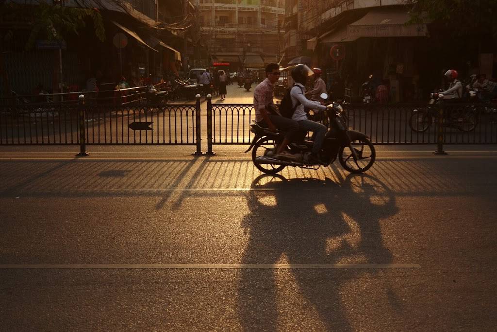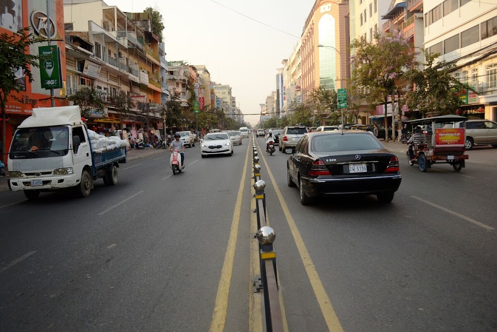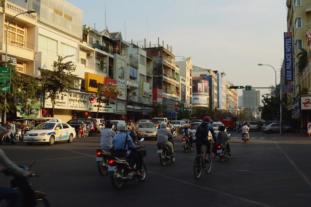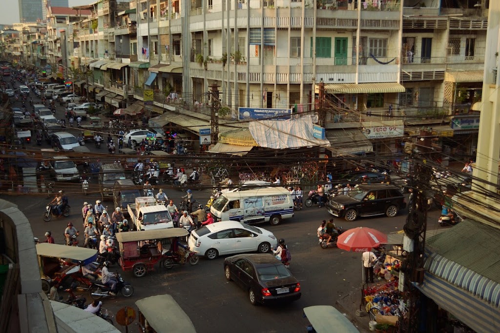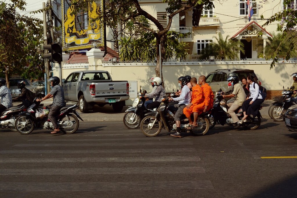 Стоя на балкончике гестхауса, можно поугорать с местного движения. Наверное, даже в Индии мы такого дурдома не видели. Светофоры в Пномпене есть лишь на самых крупных улицах. Правил дорожного движения, не знаю как в теории, а вот на практике точно нет. Каждый просто едет себе вперед как может. Переходить дорогу можно только одним способом: просто медленно, но уверенно, идя вперед. Главное, не дергаться туда-сюда, водители, в общем-то, будут объезжать пешеходов сами.
