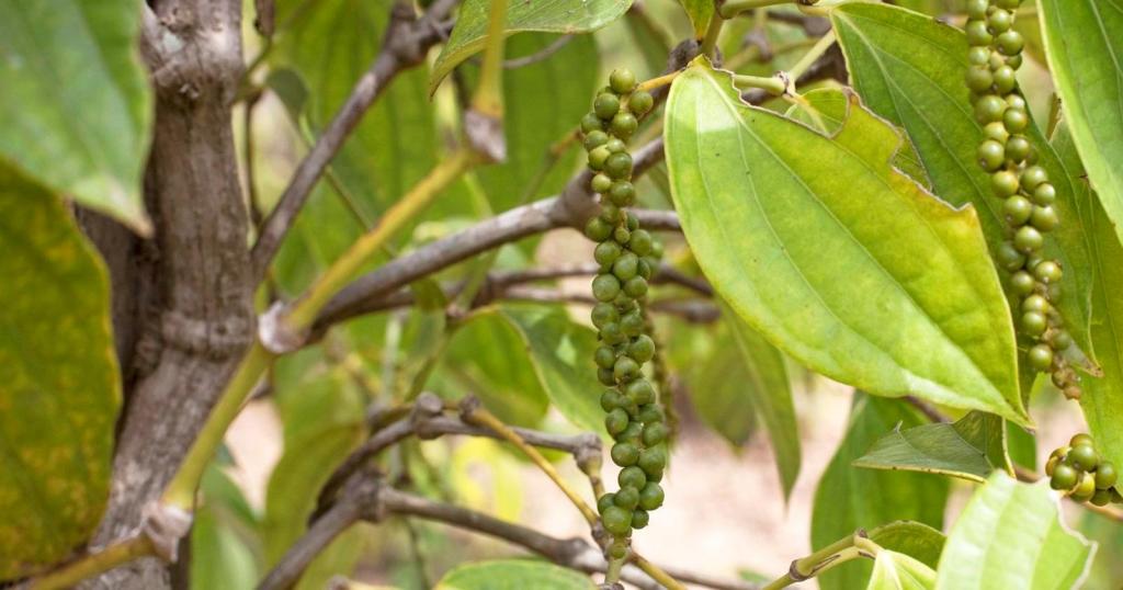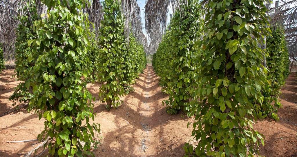 Лозы перчинки растут на столбах, аккуратно разложенных по участкам. Зеленый перец сначала появляется к сентябрю, затем созревает уже в новом году. Фермеры вручную собирают его и сушат на солнце в течение пары дней, что делает его черным.