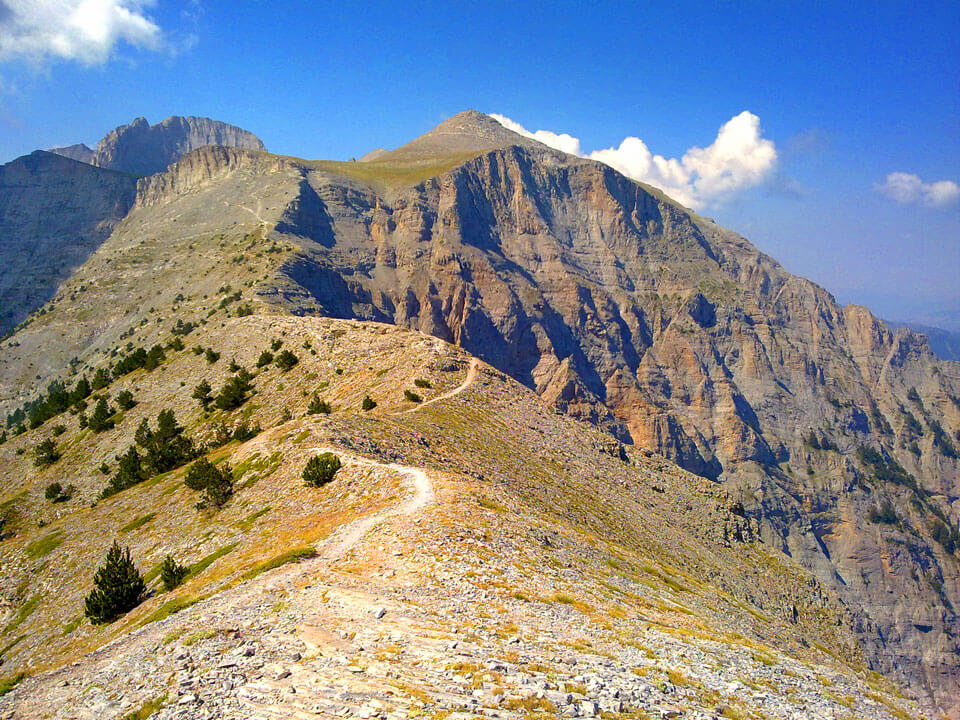Вершина горы состоит из 6 высоких пиков, имеющих своё название: Митикас (самый высокий – 2917 м), Сколио, Стефании, Скала, Агиос Антониос, Профитас Илиас (Илья Пророк – самый низкий – 2803 м). Окружают мифические заснеженные пики Плато муз и расположенные чуть ниже прекрасные альпийские луга. По преданиям, люди с древних времён пытались подняться на Олимп, чтобы быть ближе к богам, хотя простым смертным вход туда был строго воспрещён. Привратницы оры (богини времён года) зорко охраняли подступы к горе.