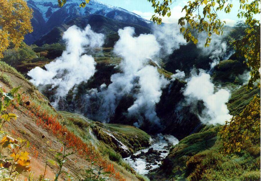 На Камчатке расположились своеобразные природные фонтаны, бьющие прямо из земли, которые сами по себе остаются удивительным явлением. В 1941 году эта долина гейзеров была открыта Т. Устиновой. Это место представляет собой скопление постоянно действующих кипящих источников, которые пульсируют и испускают паровые струи. В общей сложности их насчитали около 40 штук. Самый большой гейзер расположился на левом берегу реки под названием Гейзерная.