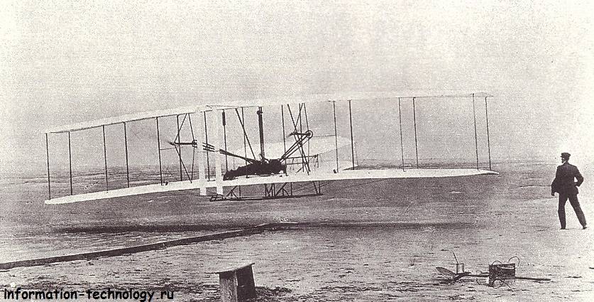 В 1906 году известным на весь мир братьям Райт удалось получить патент на «летающую машину» и способ управления ей. Первый самолет, пилотируемый человеком, совершил полет на три года раньше, 17 декабря 1903 года, причем он был официально задокументирован как управляемый (изменение курса, высоты и скорости были подвластны инженеру, который им управлял). Катапульта с рельсовым разгонным механизмом и встречный ветер со скоростью 43 км/ч помогли поднять самолет в воздух на три метра и удержать его в течение 12 секунд. За это время он пролетел 36,5 метров, и его полет был пойман объективом фотокамеры Орвилла.