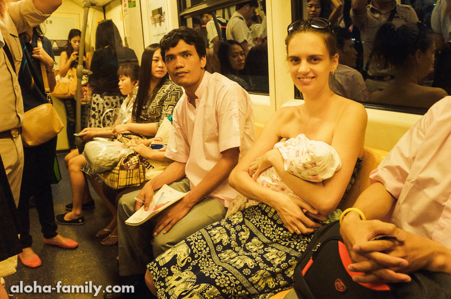 Само собой, что в метро мы немного взбодрили спешащую с работы публику. Все хотели увидеть месячную кроху европеоидной расы. Приятно, что Леночке с Оливией на руках уступали место. И, кстати, мы едва ли ни впервые увидели, что бангкокское метро бывает переполненным — не так как бывает в час-пик в Киеве, но всё же… Поясню — обычно в Бангкоке нам попадались полупустые вагоны, и не удивительно — ведь стоит метро довольно дорого (цена зависит от количества остановок), и очень часто такси выходит дешевле. Впрочем, в час-пик многие жители Бангкока, как и мы, выбирают метро — банально, чтобы не терять времени в пробках.
