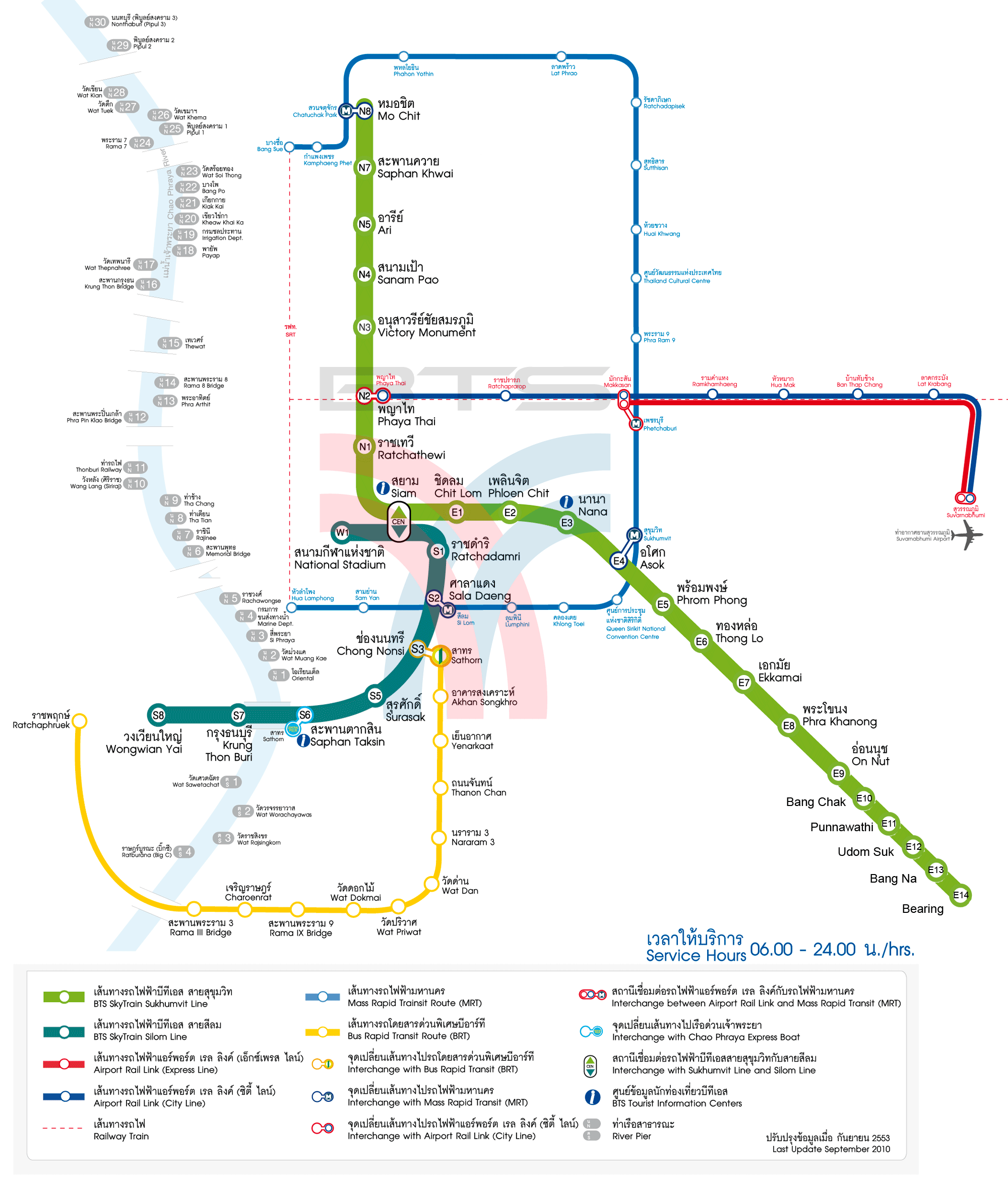 Чтобы попасть со станции Victory Monument (зелёная ветка на карте — надземное метро BTS SkyTrain) на станцию Hua Lamphong (голубая ветка на карте — подземное метро MRT), необходимо проехать 7 остановок до станции Asok, перейти на подземное метро — станция Sukhumvit, а затем ехать 6 станций до конечной остановки Hua Lamphong.