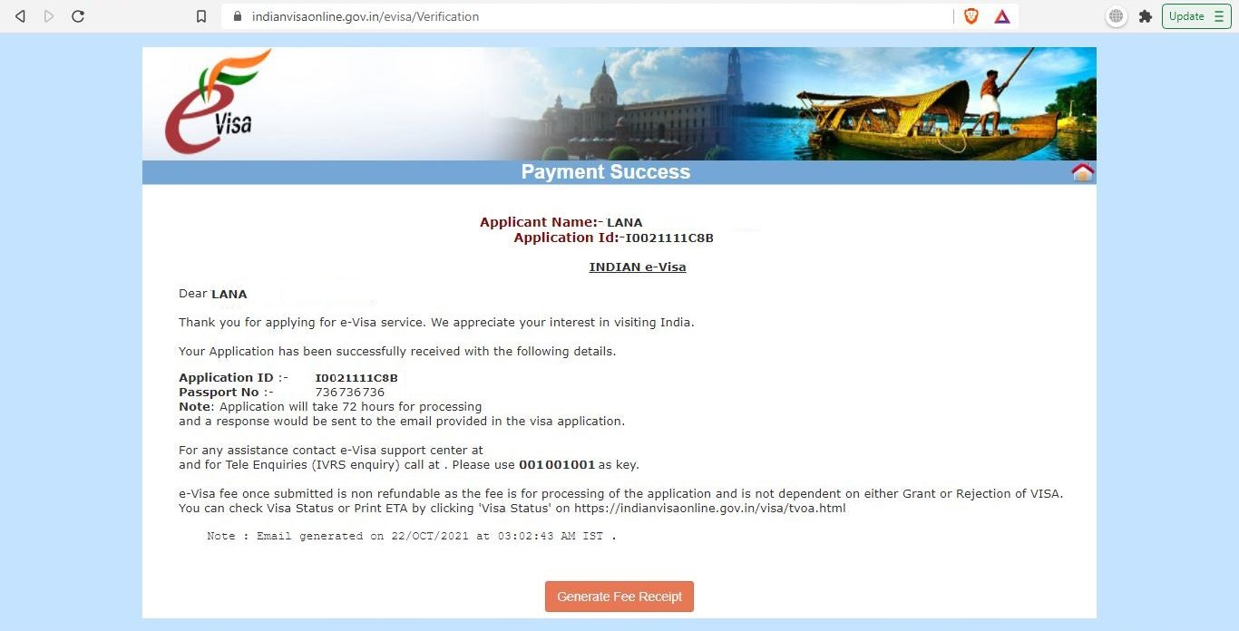 4. Получите одобрение заявления на визу в Индию: В большинстве случаев решение о вашей индийской визе будет принято в течение 1-3 дней, и если оно будет принято, вы получите индийскую визу онлайн в формате PDF по электронной почте. Рекомендуется взять с собой в аэропорт распечатку электронной визы в Индию.