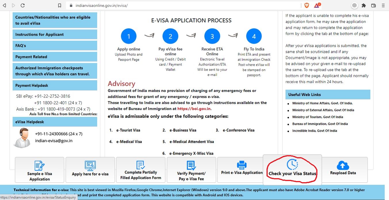 Когда данные о визе пришли на электронную почту, надо распечатать этот документ. Для этого нужно зайти на главную страницу сайта евизы в Индию: https://indianvisaonline.gov.in/evisa/ и найти внизу кнопку Check your Visa Status.