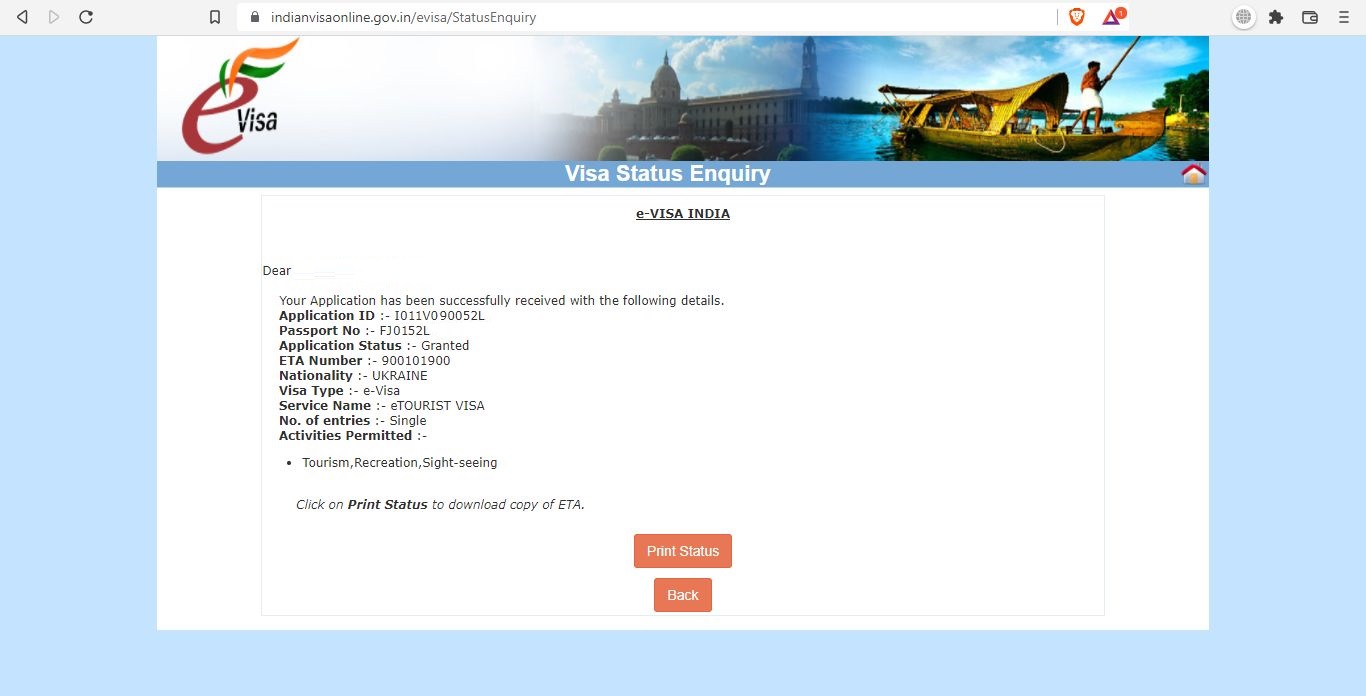Загрузится страница с заголовком «e-VISA INDIA«. На ней будут указаны данные визы. В строке Application Status должно значиться Granted. Это обозначает, что виза предоставлена успешно. Вы можете ехать в Индию в указанные даты. Теперь нужно распечатать документ с визой. Для этого нужно нажать на кнопку «Print Status», расположенную по центру внизу. Тогда же начнется загрузка файла на компьютер. Его желательно распечатать и дополнительно сохранить на смартфон.