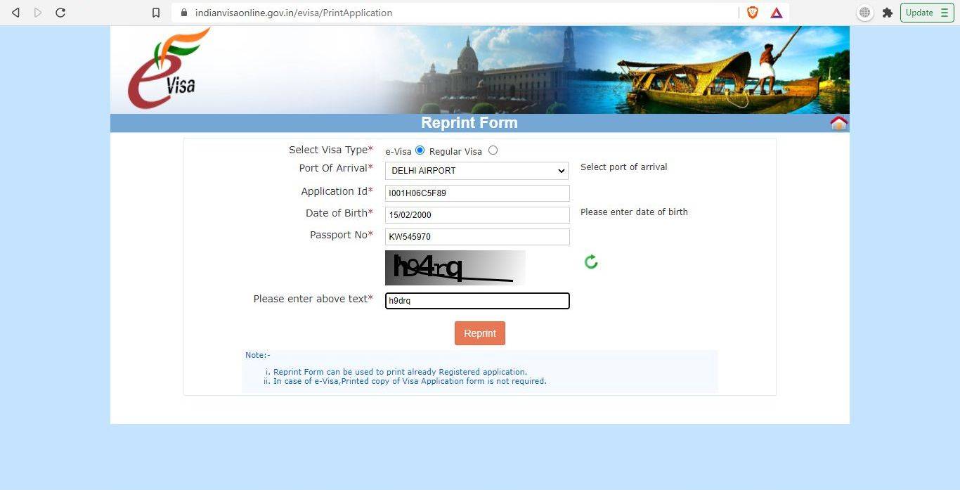 Далее предстоит заполнить основные данные (Application ID, дату рождения, номер паспорта и аэропорт прилета). После нажатия на кнопку «Reprint», система автоматически загрузит документа с данными визы. Его нужно распечатать и предъявить на паспортном контроле по прибытию в Индию вместе с уведомлением о получении визы.
