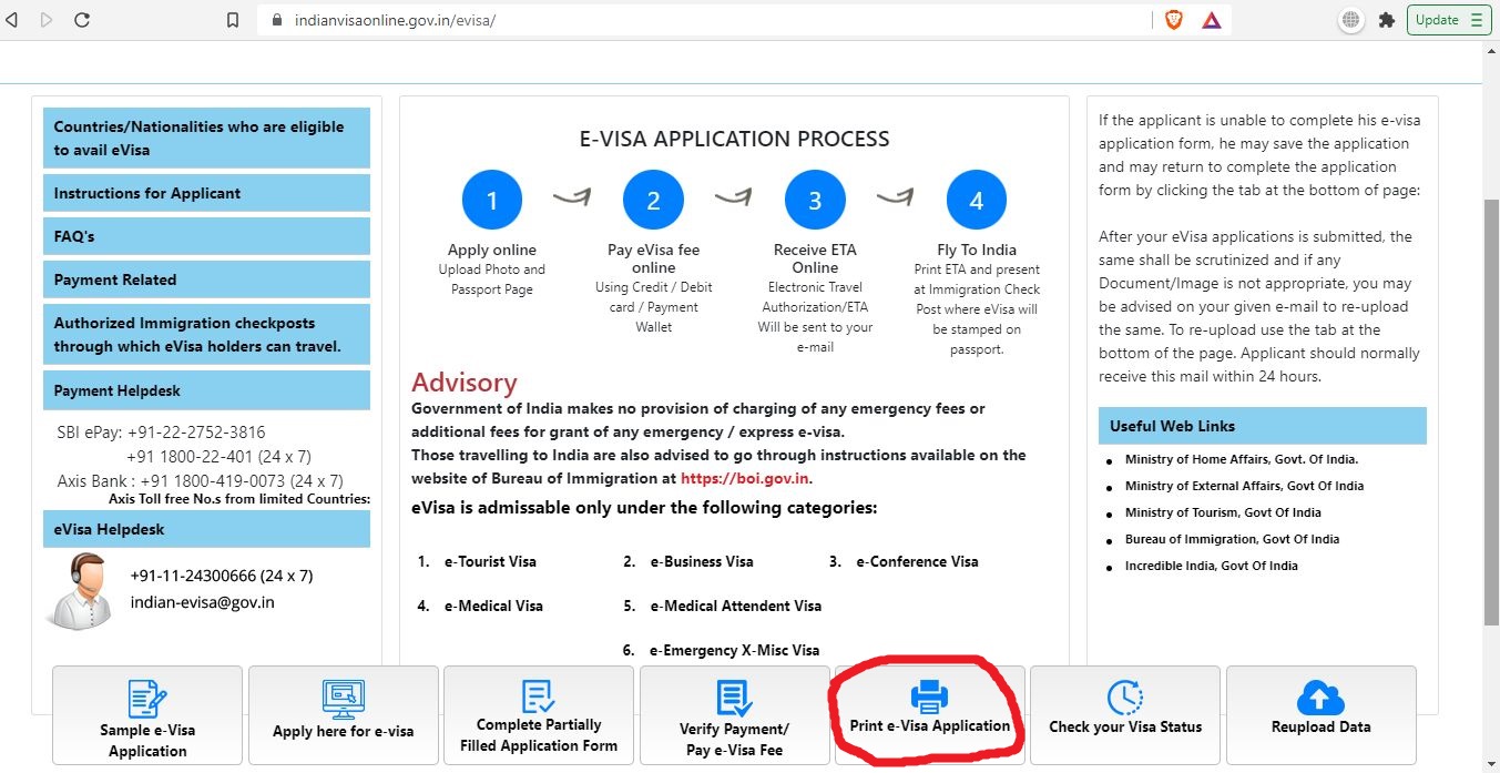 По желанию можно приложить к визе дополнительный документ в виде визовой анкеты. Для того, чтобы получить собственную визовую анкету нужно вернуться на сайт индийских виз и выбрать пункт из нижнего горизонтального меню «Print e-Visa Application».