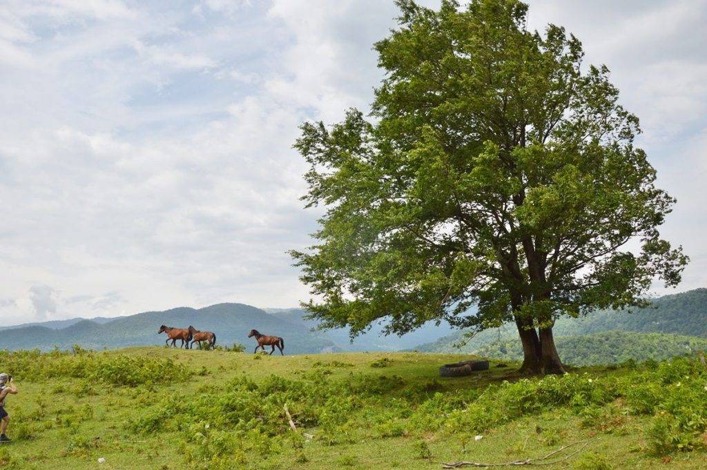 Вначале тропа резко идет в горку по разбитой дороге, по которой можно проехать на внедорожнике. Наверху виды становятся интереснее: табуны лошадей пасутся на поле, в окружении зеленых гор.