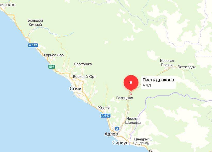 Водопад «Пасть Дракона» находится в Адлерском районе недалеко от поселка Монастырь. Высота первого водопада 41,5 метр. Место интересно тем, что второй водопад скрывается в пещере, будто в пасти дракона. С дороги его не видно и не слышно. Многие экскурсионные бюро предлагают туры к водопаду на квадроциклах. Водопад лучше посещать весной или осенью, так как в жаркое летнее время водопад пересыхает.