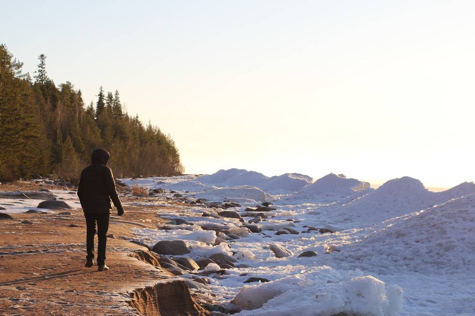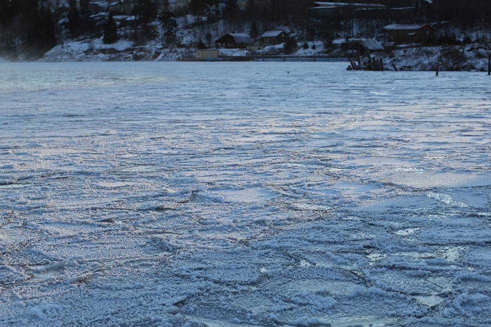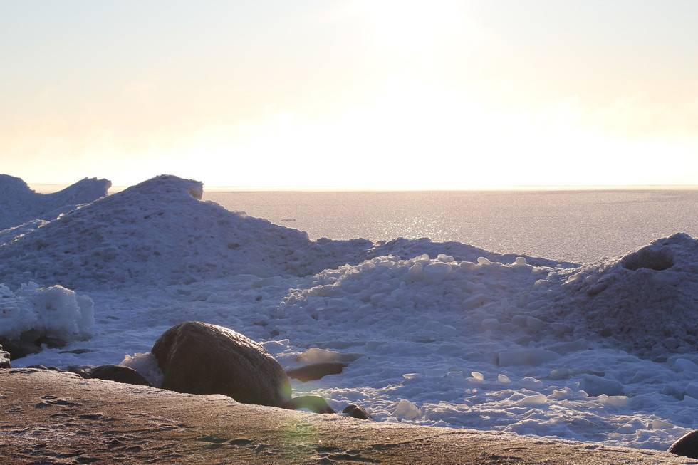 Дорога до Шлиссельбурга была просто идеальной — хорошая трасса, чистый асфальт, трасса практически всегда шла по прямой. По пути мы сделали остановку, так как проезжали мимо выхода к Ладоге. Было очень холодно, но упустить возможности побегать по льду мы не могли. На берегу горами лежали льдинки, а снег смешивался с речным песком. Над озером стоял уже знакомый туман, который пронизывало солнце, от чего казалось, что весь горизонт объят огнём.