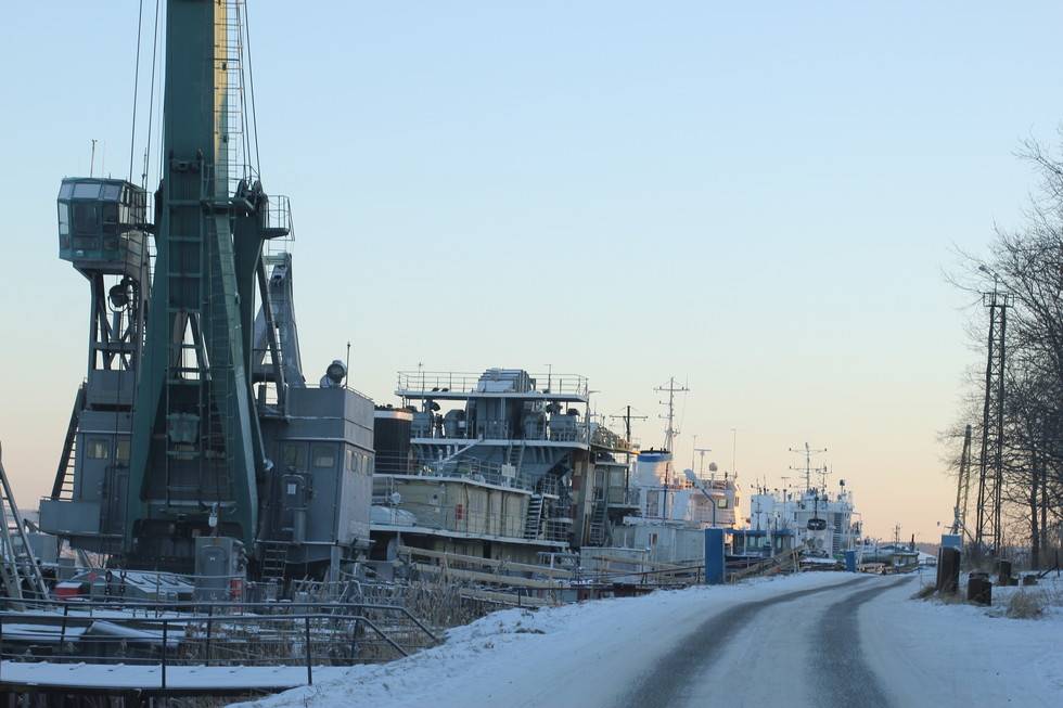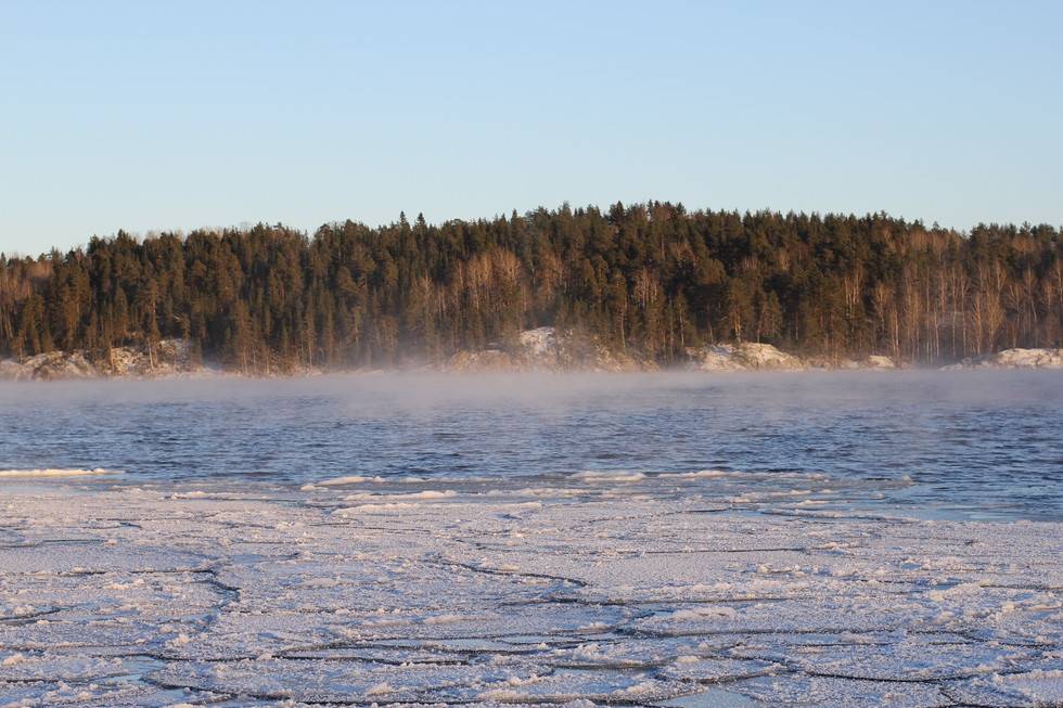 На противоположной стороне зелёные сосны, над водой стоит туман, вдоль берега причалены катера и небольшие суда. Это именно то зрелище, ради которого не жалко выбраться из машины и немного помёрзнуть.