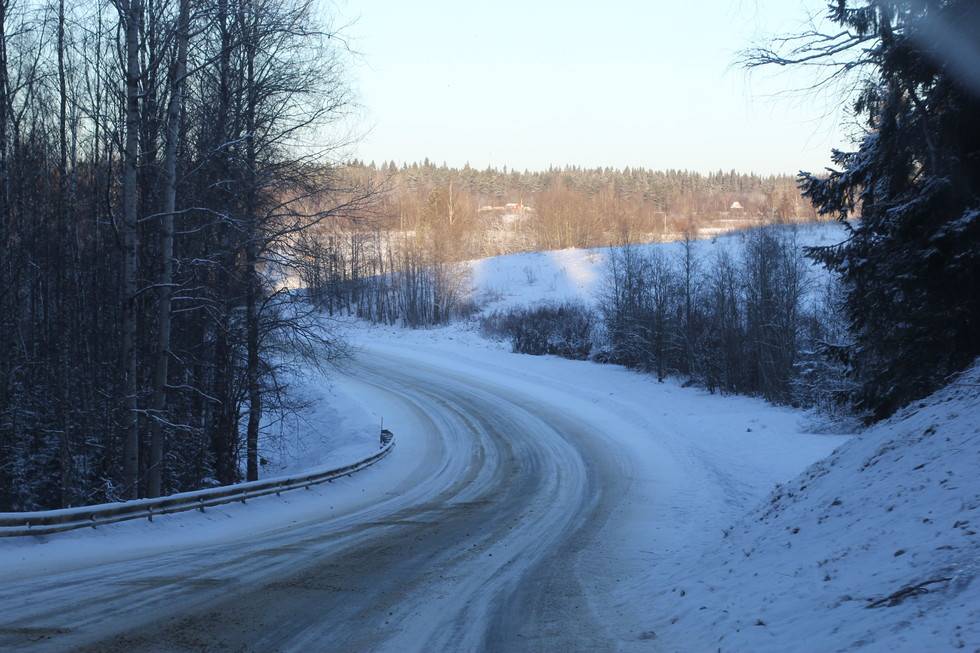 Где-то через 24 километра после Приозерска начинается Карелия. Местные дороги тяжело описать, но это просто какой-то автомобильный рай. Покрытие идеально ровное, несмотря на постоянные осадки, дорога отлично почищена, по обеим сторонам стоят великанами заснеженные хвойные деревья, а само дорожное полотно, кажется, пробито прямо в скалах. Наш путь лежал в Питкяранту, но по пути мы останавливались в Лахденпохье, потому что там есть прямой выход к Ладожскому озеру, которое в этих местах не замёрзло, а просто покрылось льдинками.