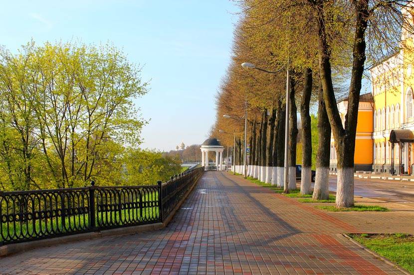 От Успенского собора до Ярославского музея-заповедника протянулась уложенная плиткой прогулочная дорожка. Слева ее украшает металлический забор, который на участке от Московского проспекта до ул. Чайковского становится каменным.