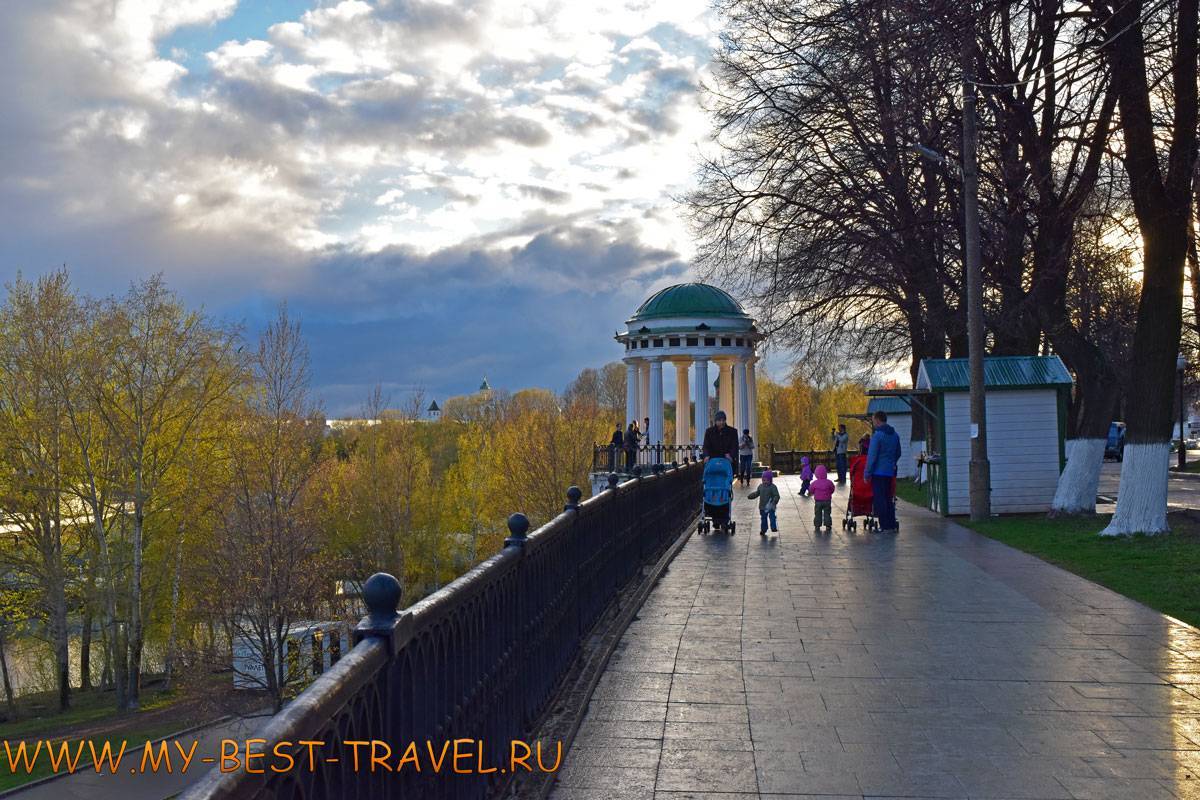 - Губернаторская беседка. На Мякушинском спуске находится знаковая достопримечательность Волжской набережной Ярославля — беседка. Она была возведена в 1840-е годы в стиле позднего классицизма. Большая часть фото Волжской набережной Ярославля делается с этой беседкой.