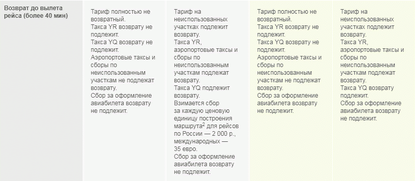 Условия возврата билетов для всех тарифов