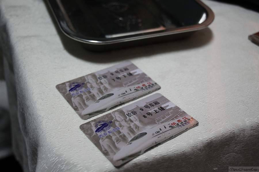 Что есть в китайских поездах? В купе на столиках стоят термосы для кипятка, в некоторых вагонах есть розетки прямо в купе, могут быть телевизоры и мусорное ведро под столом. В вагоне есть туалеты с унитазом или с дыркой, также есть отдельная умывальная комната с тремя раковинами, большим зеркалом и огромной мусоркой. Обязательно есть кулер с горячей водой, а то, как же лапшичку заварить? В поездах есть вагон-ресторан, кроме того целый день по поезду ходят разносчики с тележками с едой из ресторана и всякими китайскими снэками. Мы, правда, у них ничего ни разу не брали. Белье в китайских вагонах уже застелено, но вот нюанс нет полотенец и нет индивидуальной упаковки. После того как пассажир выходит, приходят проводники, встряхивают одеяло в пододеяльнике и просто его аккуратно складывают на полку для следующего пассажира. Белье не меняют! Так, что приготовьтесь, возможно, вы будете не первым, кто пользуется простыней и подушкой. В поезде проводник забирает у вас билеты и выдает специальные карточки с номерами мест, за полчаса до прибытия он их забирает и возвращает вам билеты: