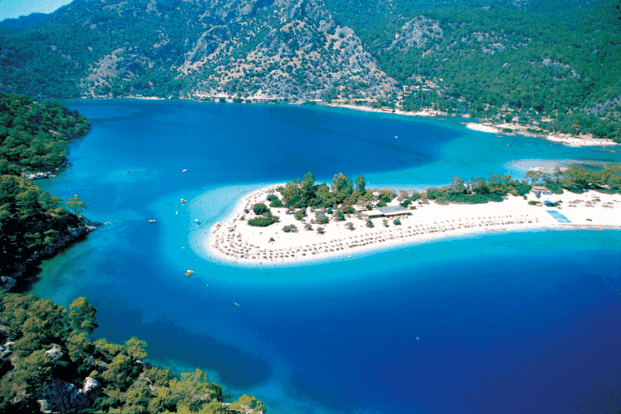 Пляж на косе Голубой лагуны имеет Голубой флаг и претендует на звание лучшего пляжа Турции и одного из самых красивых пляжей мира. Он находится на территории природного парка.