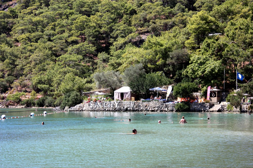 Самый живописный и популярный пляж в Олюдениз – это Голубая Лагуна. Вход платный — 8 лир. Море здесь мелкое, поэтому оно идеально подходит для отдыха с детьми. На выходных здесь очень много народа. На пляже работают рестораны и бары, где можно пообедать.