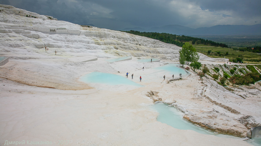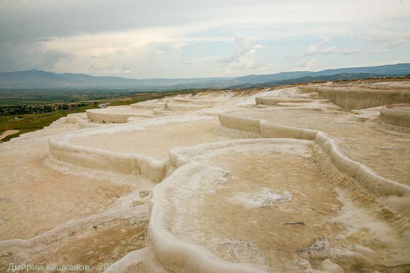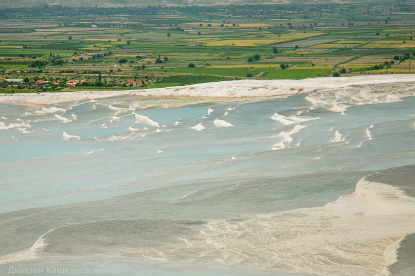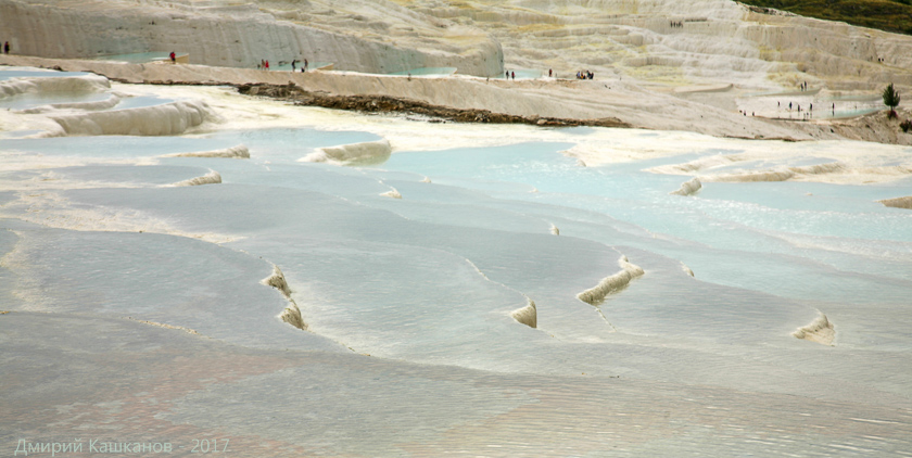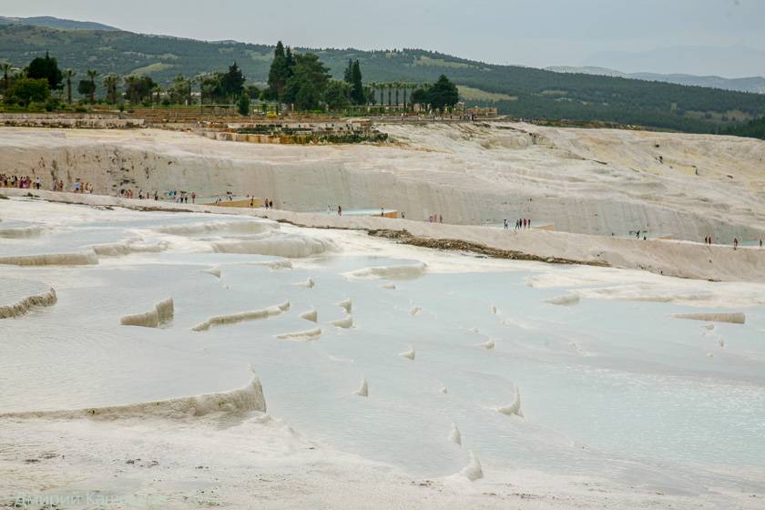 Обойдя вершину горы, мы наконец увидели то место, которое показывают в рекламных проспектах. Это чашеобразные травертины, по которым стекала вода. Они были бело-голубыми. Ходить по ним тоже было запрещено. Наверное их “вылепили” гораздо раньше, поскольку все они уже затянуты белым налетом: