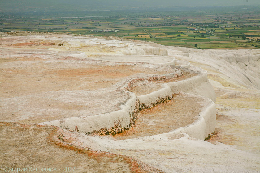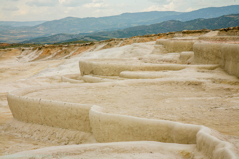 Такое впечатление, что бортики сделаны специально, чтобы сформировать будущие бассейны. Возможно, я не прав, но отделаться от впечатления “рукотворности” данного памятника природы после данного фото я уже так и не смог. Со временем сюда пустят воду из геотермального источника, которая за несколько лет закроет белыми отложениями эти вылепленные полукружья. Вот вам и чудо света!