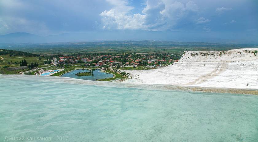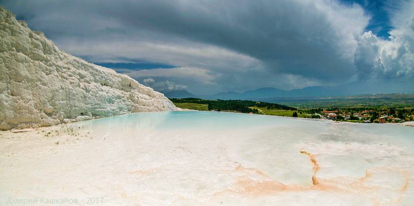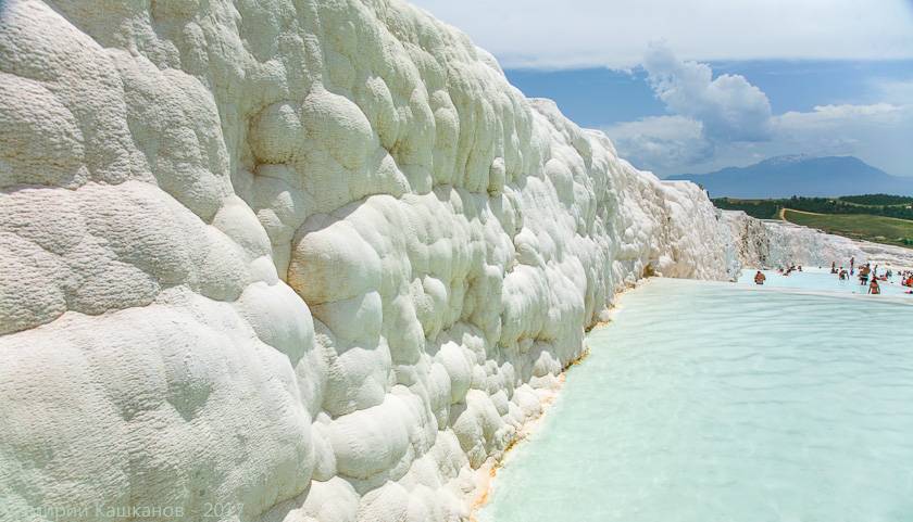Если начать двигаться от входа вдоль белой стены, то слева то и дело будут встречаться небольшие ванны с удивительно прозрачной бирюзовой водой. Эти ванны сделаны искусственно, чтобы собрать стекающую воду и дать возможность туристам полежать в воде или обмазаться белым лечебным илом. Говорят, он полезный, однако проверить на себе его чудотворное действие мы не успели. Слишком мало оставалось времени. Наверное, сюда все же лучше приезжать на два дня с ночевкой в ближайшем отеле.