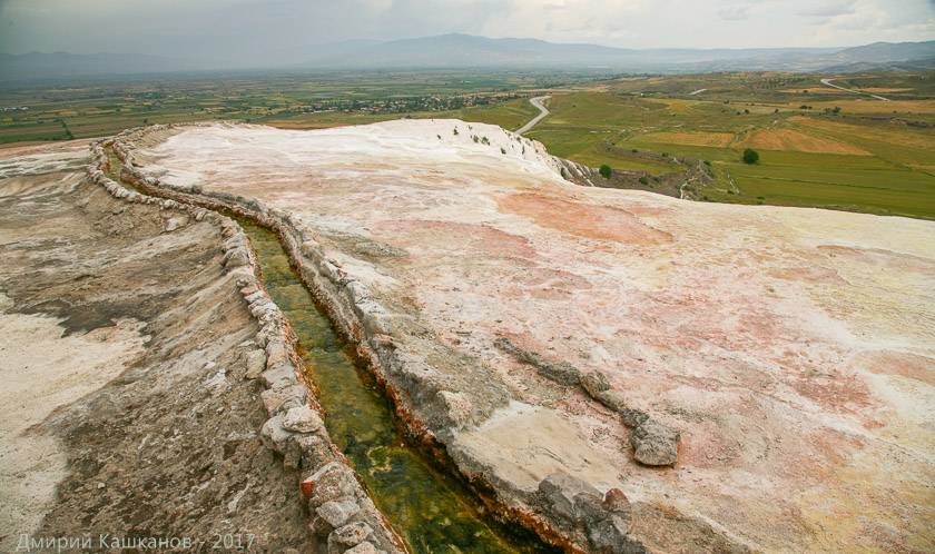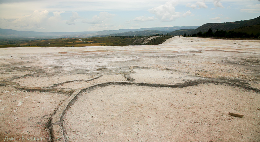Вначале камень совсем и не белый, а зеленовато-красный, местами скользко, а местами даже больно. Нужно быть максимально осторожным! Тем временем сбоку открылся вид на травертины, которые были раньше доступны к посещению и были с водой, сейчас же они высохли — именно они на всех рекламных буклетах Памуккале.