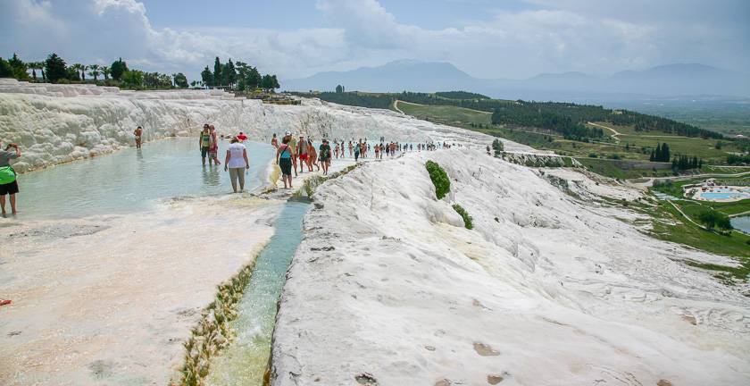Все же, самое главное, зачем сюда приезжают, это, конечно же, белоснежные травертины. Просто удивительно, но по ним можно ходить. Правда, босиком. Обувь придется снять и оставить на входе.