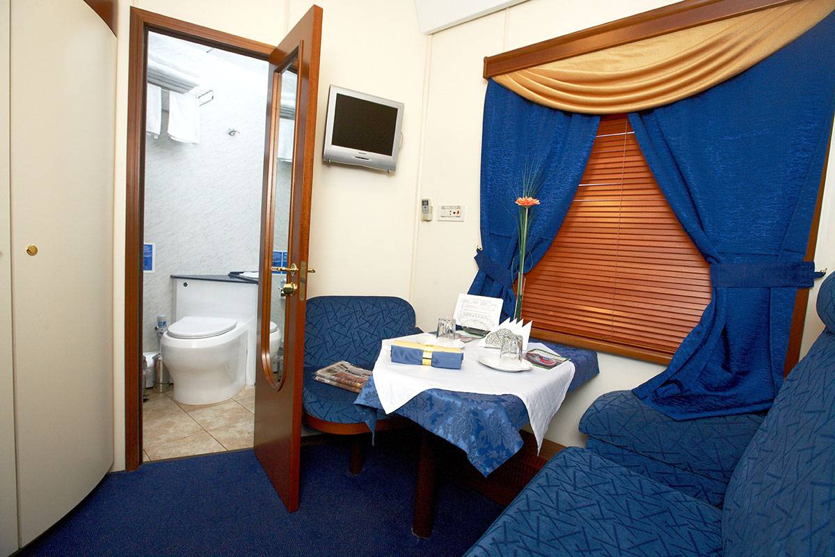 - Вагоны премиум-класса. Они имеются на туристических поездах. В вагоне всего 4-5 купе за счет их большого размера. Внутри кроме спальных мест могут быть кресла, ванная комната (туалет, душевая кабина), телевизор и пр.