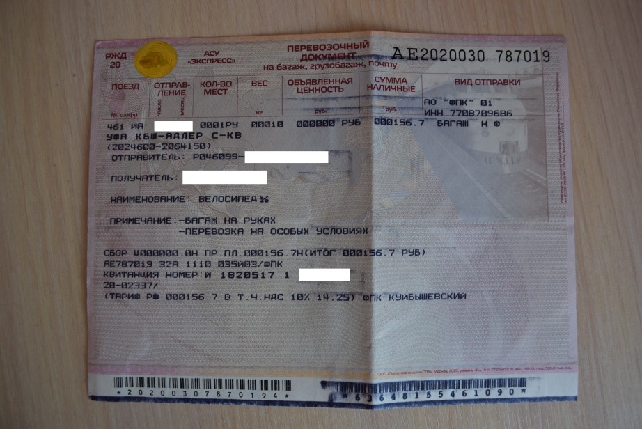 Первое, что мы сделали по приезду на железнодорожный вокзал — пошли оформлять билеты на велосипеды. В итоге вот какой билет мы получили в кассе ржд, причем каждый велосипед был оформлен отдельно на каждого пассажира: отправитель и получатель ваши ФИО. Из билета видно, что за один провоз велосипеда из Уфы до Адлера мы отдали: 156 рублей с копейками. Эта маленькая сумма избавила нас от проблем с проводником и пассажирами.