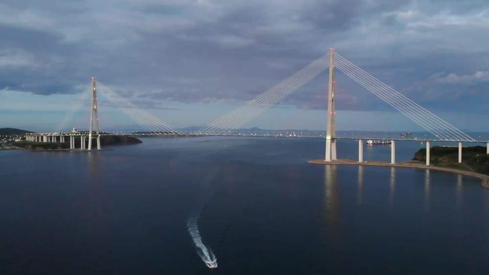 - По вечерам опоры моста, тросы крепления и дорожное полотно освещаются сложной светодиодной подсветкой. Особенно красиво мост выглядит из проплывающего по проливу катера.