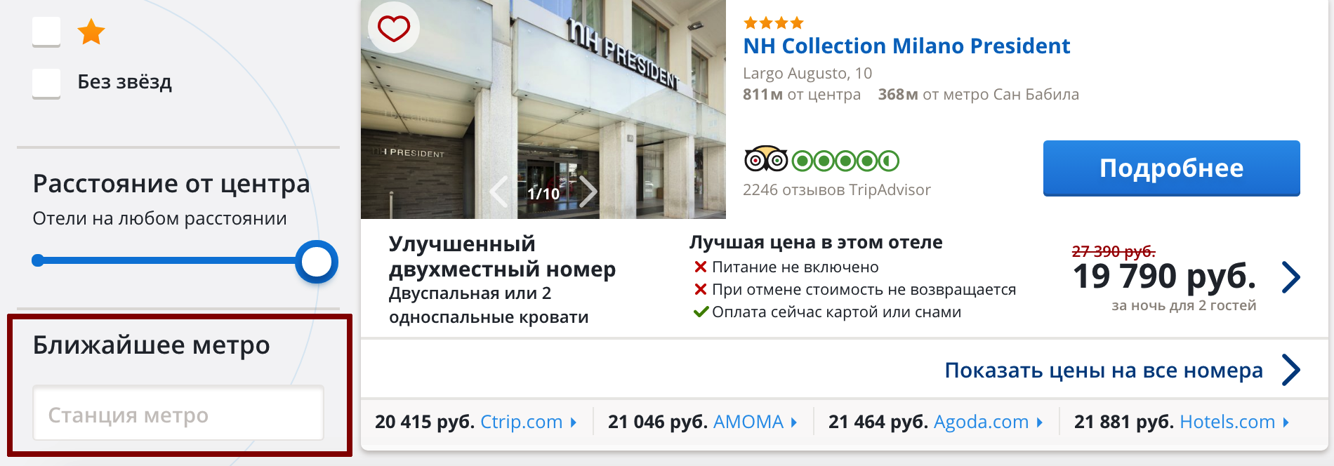 Здесь вы можете указать станцию метро, рядом с которой хотите найти отель.