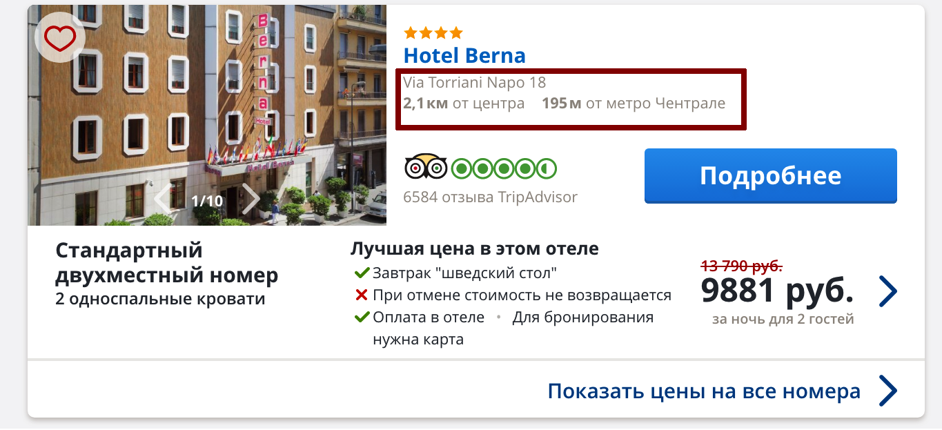 Точное расстояние можно будет увидеть на карточке отеля. Мы показываем не только расстояние до метро, но и до центра города.