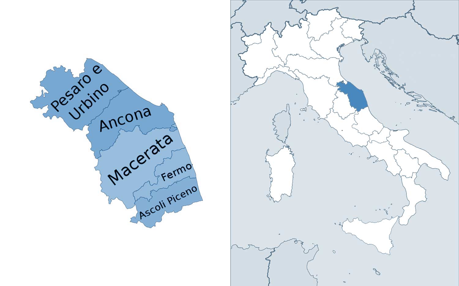 Площадь в 9366 км² — это около 3,2% всей Италии. Численность населения по ситуации на 2013 год – 1 545 155 человек, из них 100 000 проживают в административном центре Анкона. В состав региона входят пять провинций: Анкона, Фермо, Асколи-Пичено, Мачерато и Пезаро-э-Урбино.