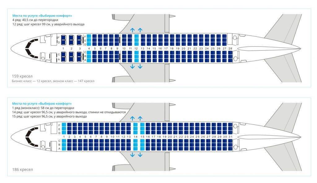 Но у Вoeing 737 иногда может различаться планировка, выделяют самолеты вместимостью 156 и 186 кресел, из-за этого ряды сдвигаются и эконом-класс уменьшается.