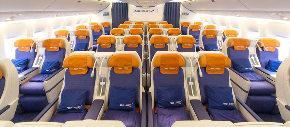Пассажирский салон самолета Аэрофлота состоит из 51 ряда сидений. Ряды с первого по пятый — это бизнес класс. Конфигурация мест в бизнес классе прекрасно подходит для дальних маршрутов. Всего для бизнес класса предусмотрено 30 мест с компоновкой 2-2-2. Расстояние между каждым рядом кресел — 152 см. Кожаные кресла с опускающимися до конца спинками позволяют превратить места в полноценную кровать. Каждому пассажиру предлагается индивидуальный дорожный набор подушек, масок для сна и пледа. Вход USB, розетка для смартфона или ноутбука, интернет будут очень кстати деловым людям, которые желают провести полет с пользой. В меню бизнес класса входят горячительные, алкогольные и прохладительные напитки. Все напитки и блюда подаются в фарфоровой и стеклянной посуде. Пассажирам бизнес класса отведена отдельная туалетная комната.