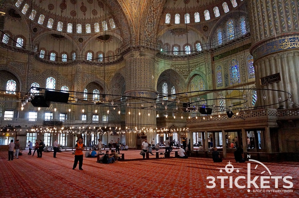 Название Голубая происходит от двадцати одной тысячи керамических плиток, имеющих бирюзовый цвет. Бирюза — основной цвет храма. Свет, падающий из двухсот шестидесяти окон, создает сюрреалистическую атмосферу в мечети. У Голубой мечети есть шесть минаретов, у каждого минарета по два или три балкона. Интересно, что Султан имел свою собственную лоджию наверху, в которую можно было добраться прямо на лошади. Внутренние помещения поражают высотой потолка и величием, пол полностью покрыт коврами. Вход в мечеть свободный для всех.