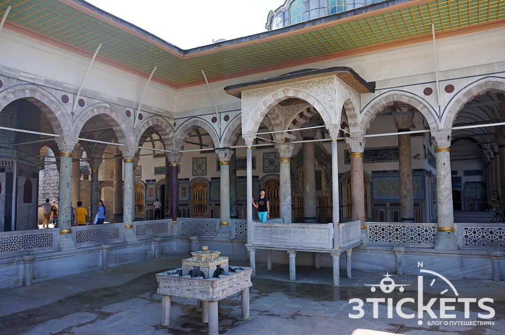 — Дворец Топкапы – являлся центром Османской империи до XIXвека. Громадный дворцовый комплекс с множеством башен, являющийся шедевром османской архитектуры. Примечателен изумительными интерьерами и роскошными внутренними дворами, украшенными сложной росписью.