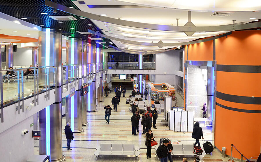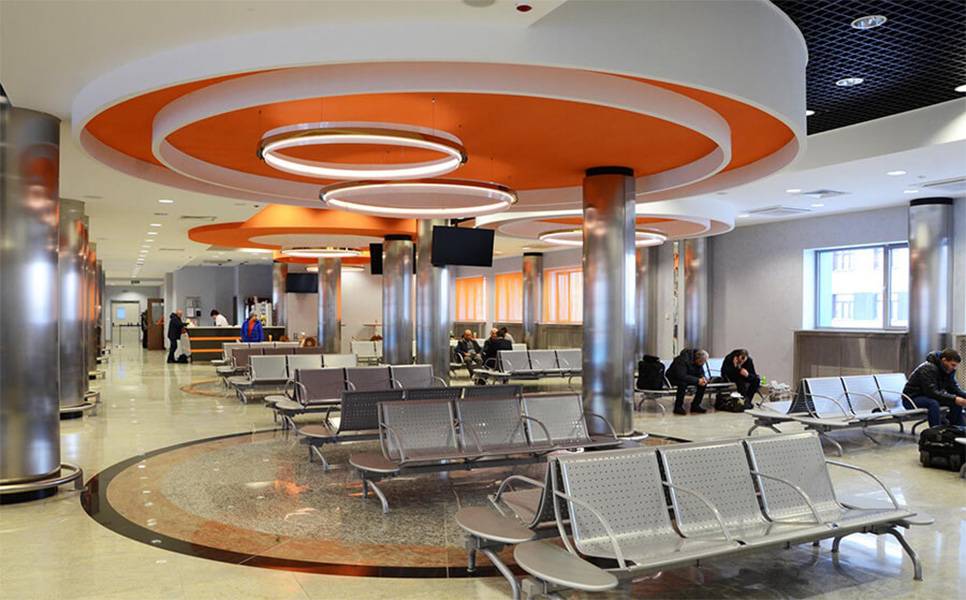 Внутри залов ожидания установлены металлические сидения. Стены выполнены из серого камня под мрамор на втором этаже. Первый этаж радует глаз светлыми стенами. Стойки регистрации расположены напротив выхода из терминала.