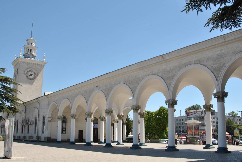 Это очень легкий, воздушный, словно парящий вокзал, который отлично вписывается в антураж южного, теплого курортного города. Большие арки галерей, высокая башня с часами, циферблаты которых украшены звездами и знаками зодиака, просторная ротонда со звездой и длинным шпилем, внутренний дворик с фонтаном… Великолепное здание в стиле сталинского ампира полностью построено из белого известняка Инкермана, что только подчеркивает его изящество и легкость.
