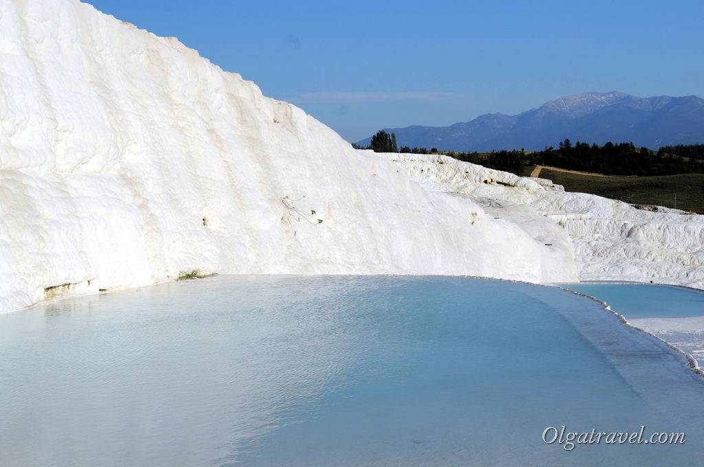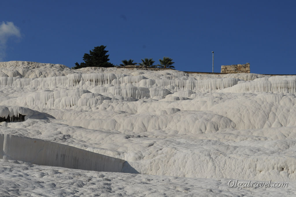 Травертины Памуккале (белые террасы причудливой формы) образовывались в течении многих лет за счет отложения солей карбоната кальция, который содержится в минеральных водах, стекающих с горы. Гора не соленая!