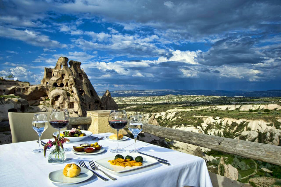 Из его окон открывается потрясающий вид на долину, а сам отель занимает несколько «дымоходов фей» — причудливых скал, которые получились в результате извержения вулкана. Кому-то «дымоходы» напоминают космические корабли, кому-то — сталактиты или колонны сказочных храмов.