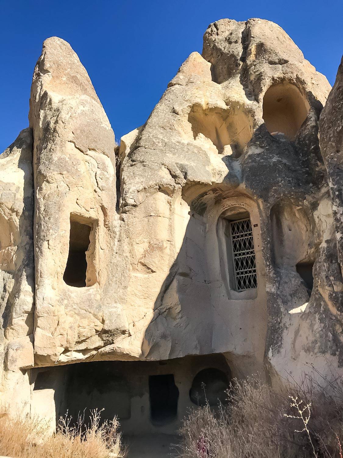 Между Розовой долиной и долиной Мечей есть потайной каньон, где скрываются пещерные жилища. Туда ведет одна из тропинок на картах maps.me. Там мы нашли, пожалуй, самые труднодоступные постройки в Каппадокии. Многие из них находятся в полуразрушенном состоянии из-за землетрясений.