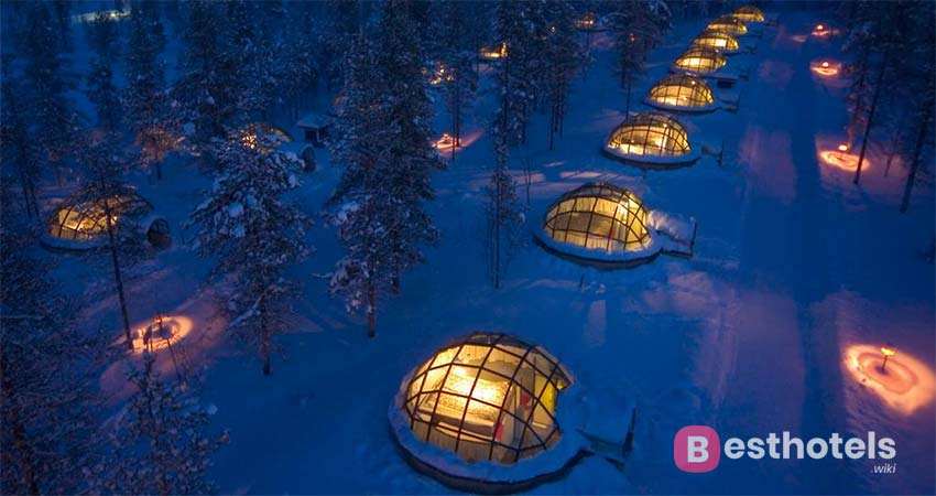 От обыденных лапландских изб этот необычный отель выделяется повышенной комфортабельностью. Два десятка полностью передовых домиков изготовлены из высокотермального стекла, через которое возможно наслаждаться северным сиянием прямо из номера. На территории необычного комплекса находиться финская сауна, которая считается самой большой в мире. Так же имеются два ресторана, где вы можете побаловать себя изысканными деликатесам лапландской кухни. Особенный акцент здесь сделан на активный и экскурсионный досуг. Покататься в упряжке с хаски или оленями по здешним местам действительно волшебно.