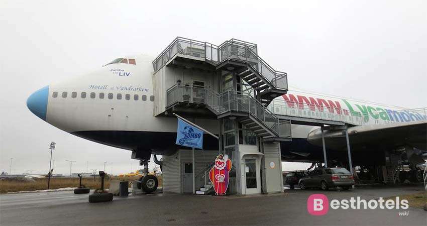 Если частые перелеты для вас обыденное дело, то этот непривычный отель, оборудованный в самолете Боинга 747 определенно заслуживает вашего внимания. Находиться он недалеко от аэропорта города Стокгольм. Все внутреннее оснащение самолета было демонтировано, а сам салон неоднократно дезинфицирован. В результате получилось почти три десятка комнат. Обычный номер имеет площадь в шесть квадратных метров. Даже имеется люкс – номер в кабине пилотов с индивидуальным туалетом. Для других постояльцев все удобства расположены в коридоре. Из люкса вы сможете любоваться красочной панорамой аэропорта. Каждая комната оборудована телевизором, так нужный вам рейс вы точно не пропустите. На территории отеля имеется небольшой кафе-бар.